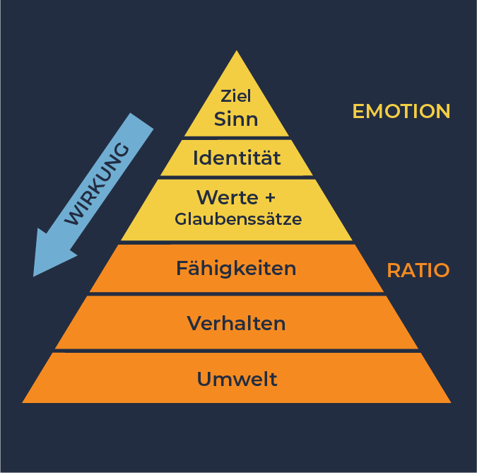 Wir arbeiten mit dem Fünf-Ebenen-Modell von Gregory Bateson, das rationale und emotionale Ebenen miteinander verbindet. So berücksichtigen wir in unserem Ansatz: